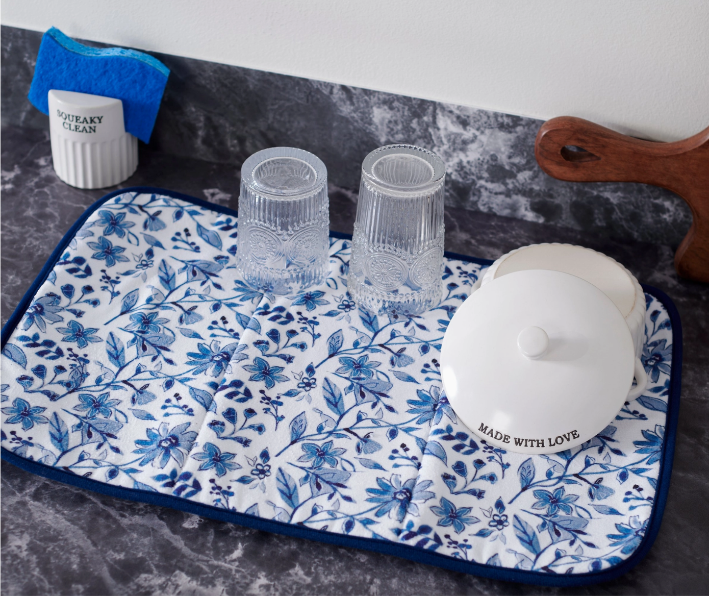 An ultra-absorbent drying mat from our Indigo Collection Collection displaying an ornate pattern of blue florals. Ornate florals design is replicated from original artwork hand painted in a unique watercolor style. Floral drying mat features a full color design on the 21 inch by 14 inch space to place items to dry with coordinating blue color on the back and trim. Our Blue Florals drying mat includes a hanger at the top to display design or to air dry when not in use. Drying mat is conveniently machine-washable for easy cleaning and folds up for easy storage. A stylish kitchen accessory perfect for everyday use.