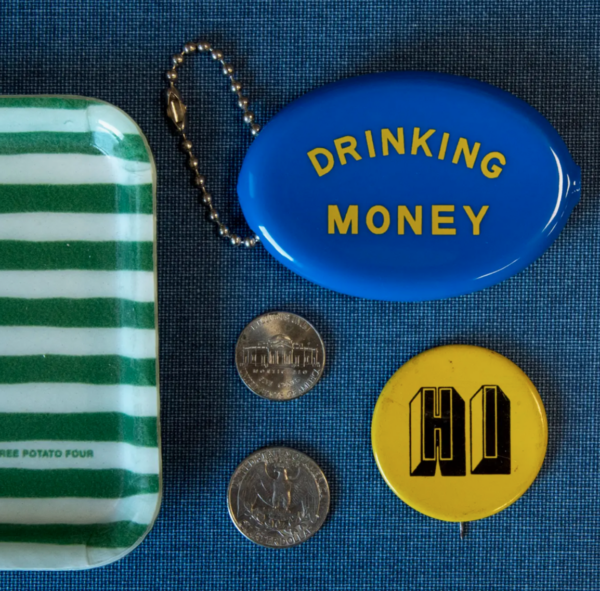 Once a memento of old-school amusement parks and Summer camps, these vintage-inspired rubber coin pouches adorned with the latest Three Potato Four designs are our new favorite accessory. Stays closed keeping all of your coins, cash, and secrets safe. Squeeze to open. Great as: Coin Purse (of course!) Cutest accessory for your bag. Clever way to give a small gift. Secret Stash Hideaway Quick Ship 3” x 2” This pouch is blue with a “Drinking Money” message in yellow. Made in U.S.A.