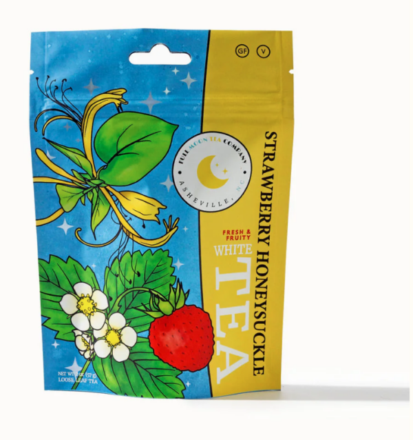Organic white tea, strawberries, organic lemon peel, honeysuckle flowers.